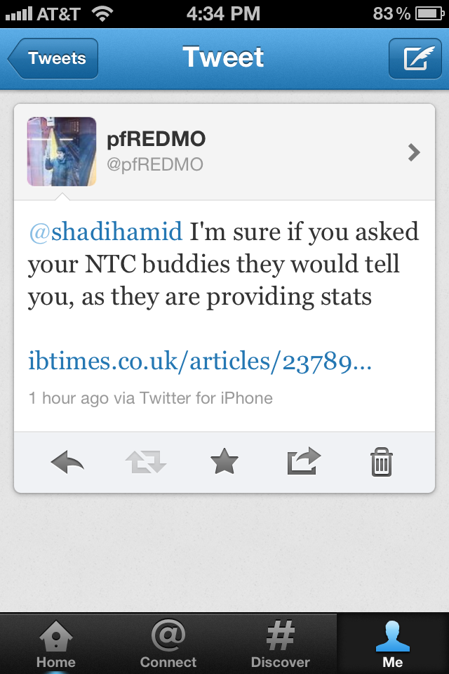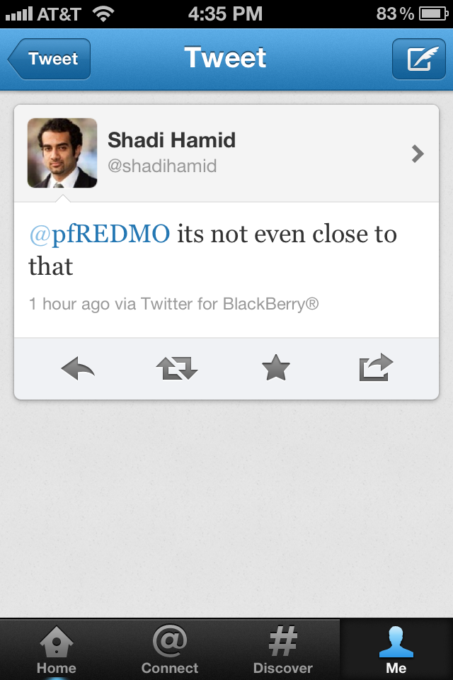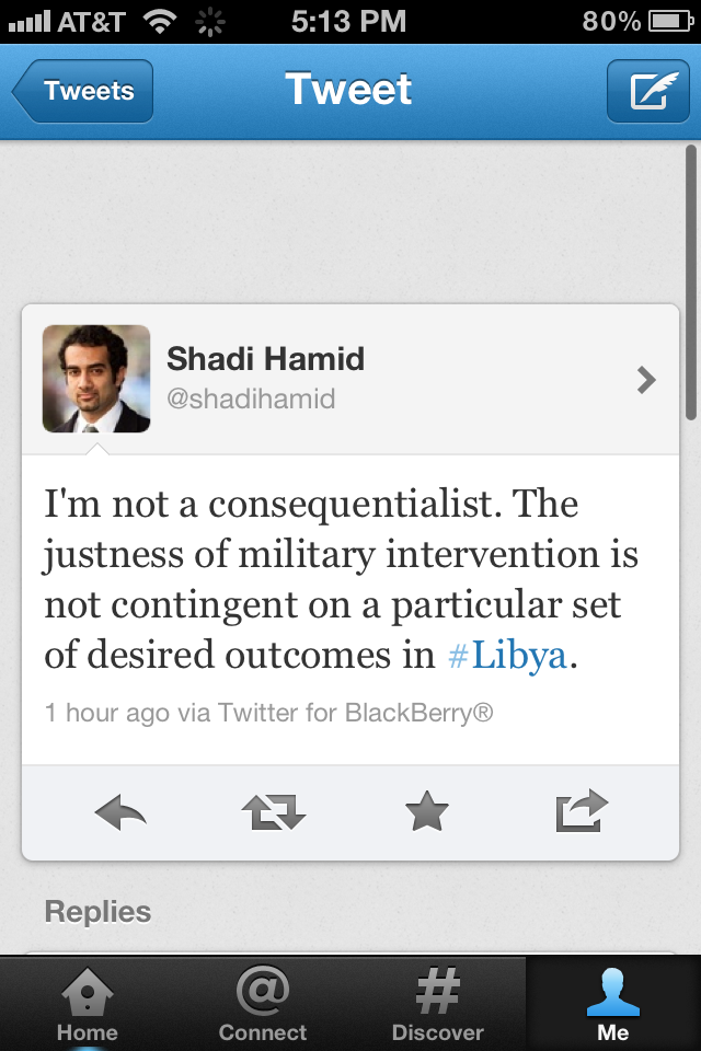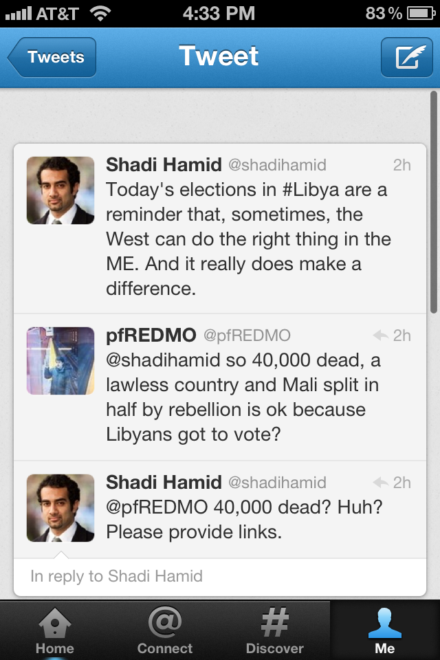 Shadi Hamid, the Director of Reashearch at Brooking Doha Center Center, has become a cheerleader for Western intervention. If you follow Middle Eastern politics at all than you will be very familiar with Shadi Hamid. Latley Hamid has become a cheerleader for Western intervention in the Middle East. He pushed hard for the West to get involved in Libya, and has been urging world powers to set up “safe zones” in Syria. It is very troubling that a man as smart as Hamid would be so cavalier about getting involved in another civil conflict in an Arab nation. This morning me and him got into a little bit of a Twitter fight.